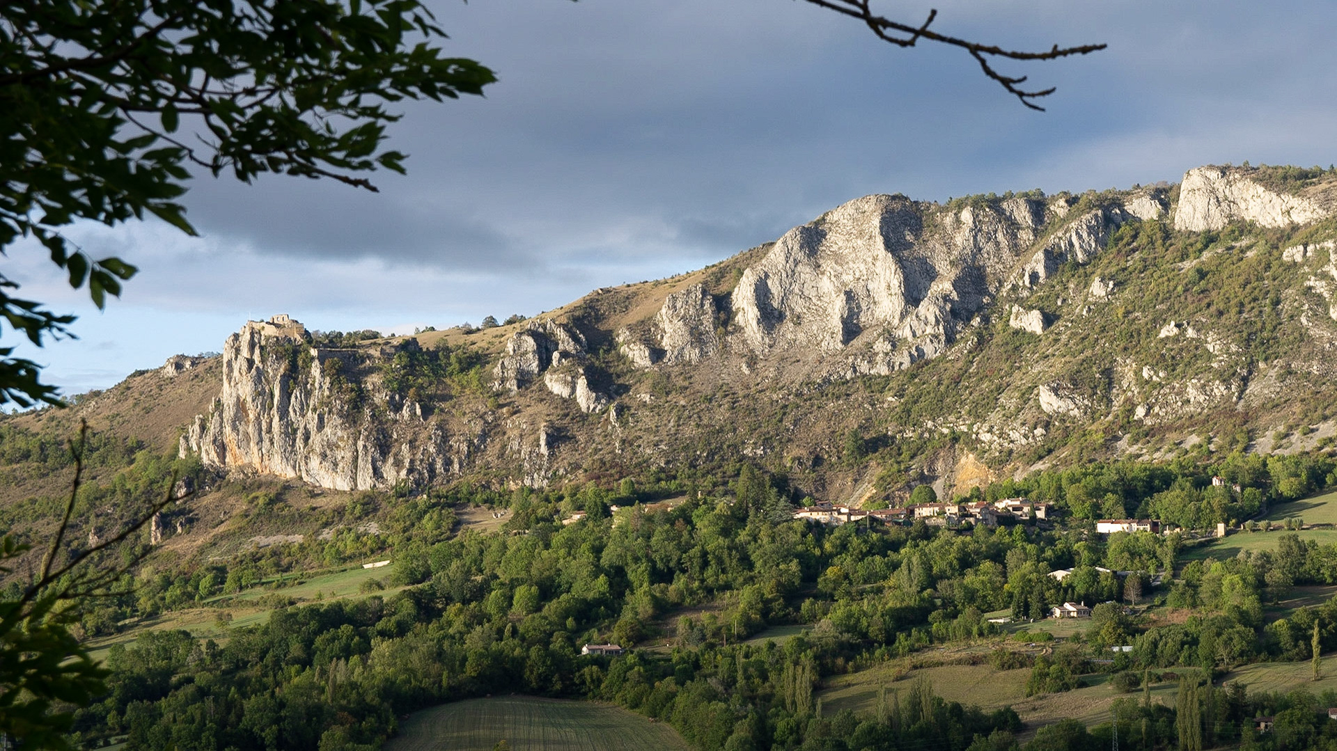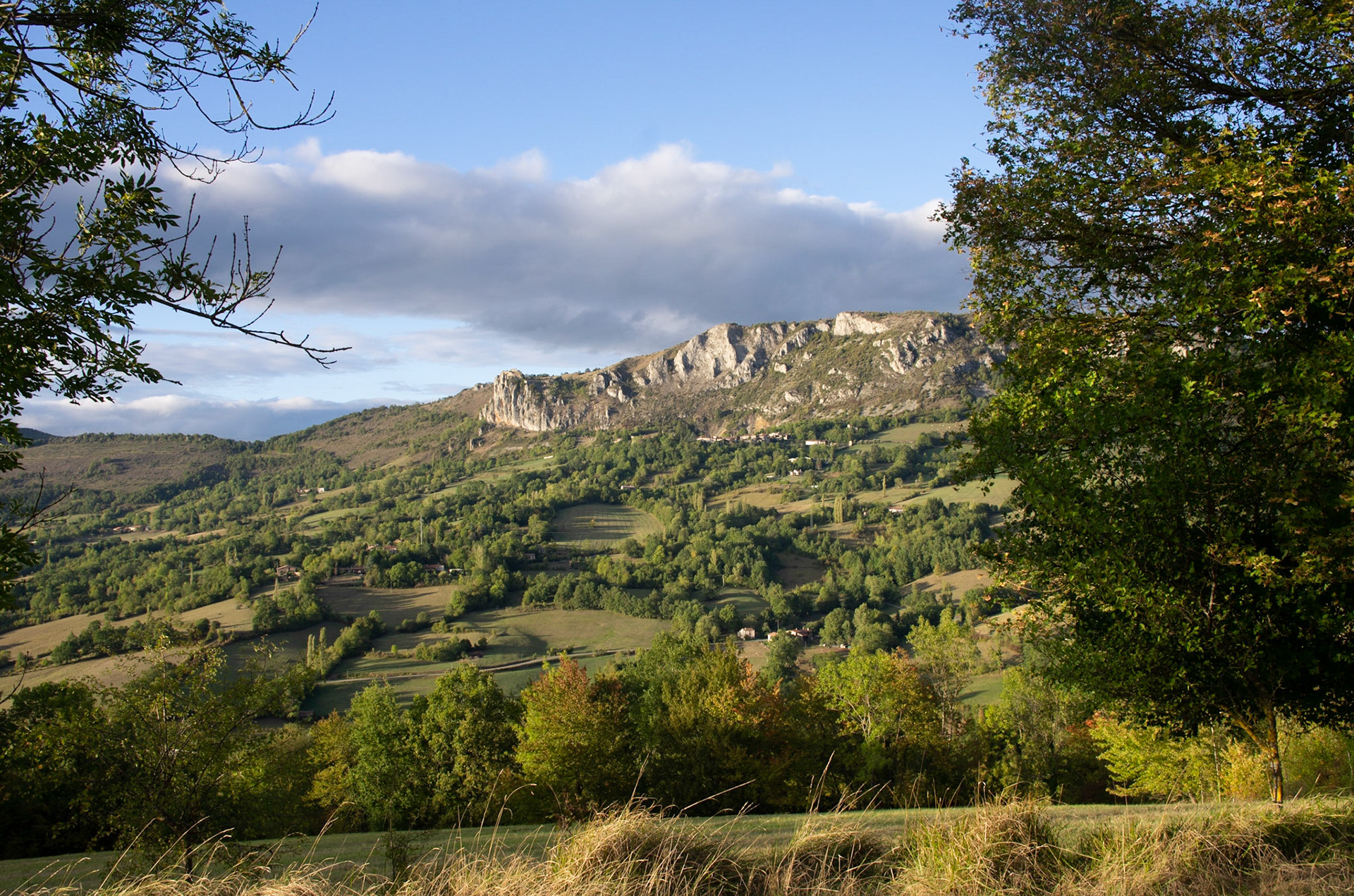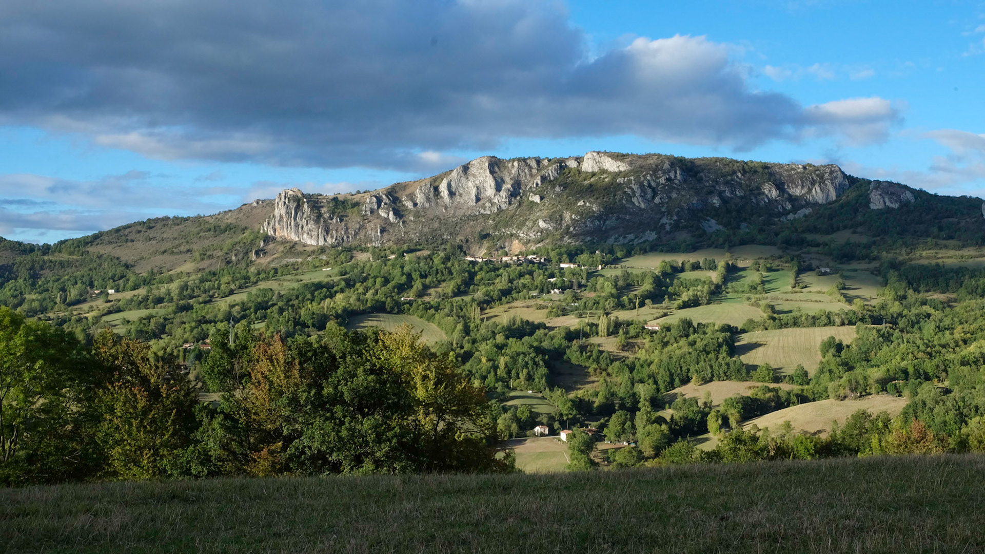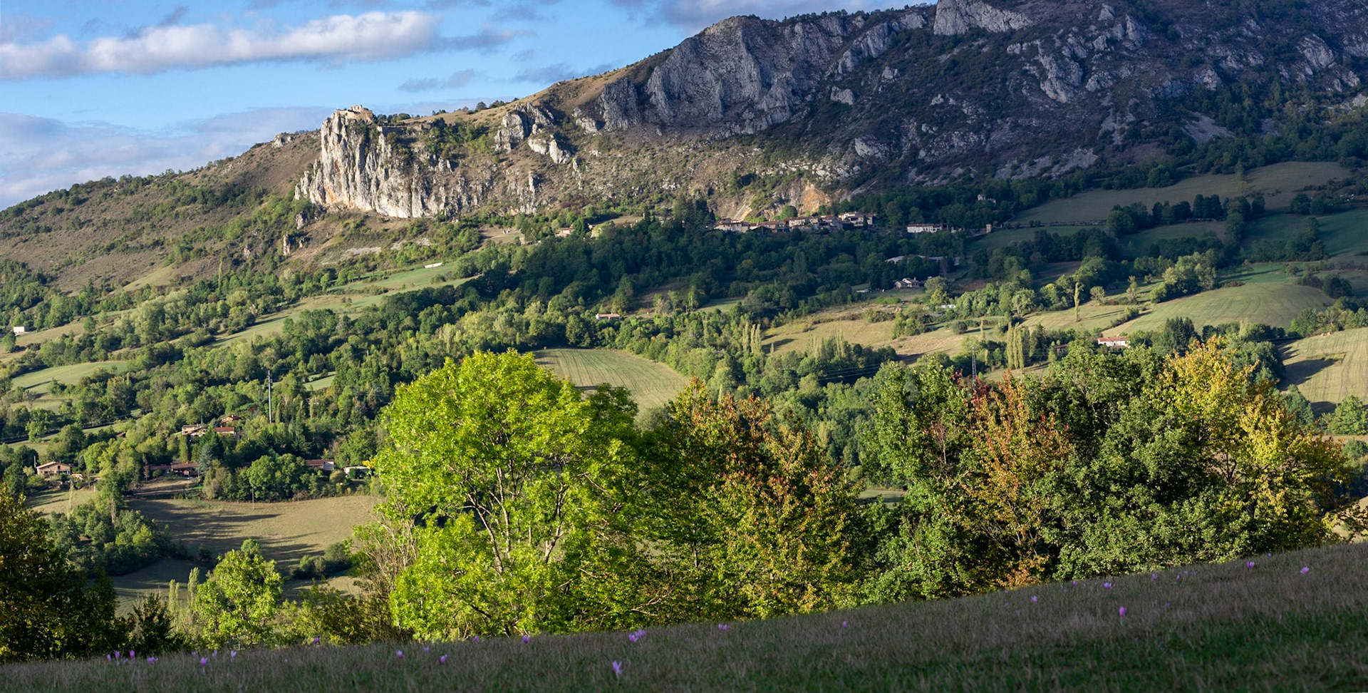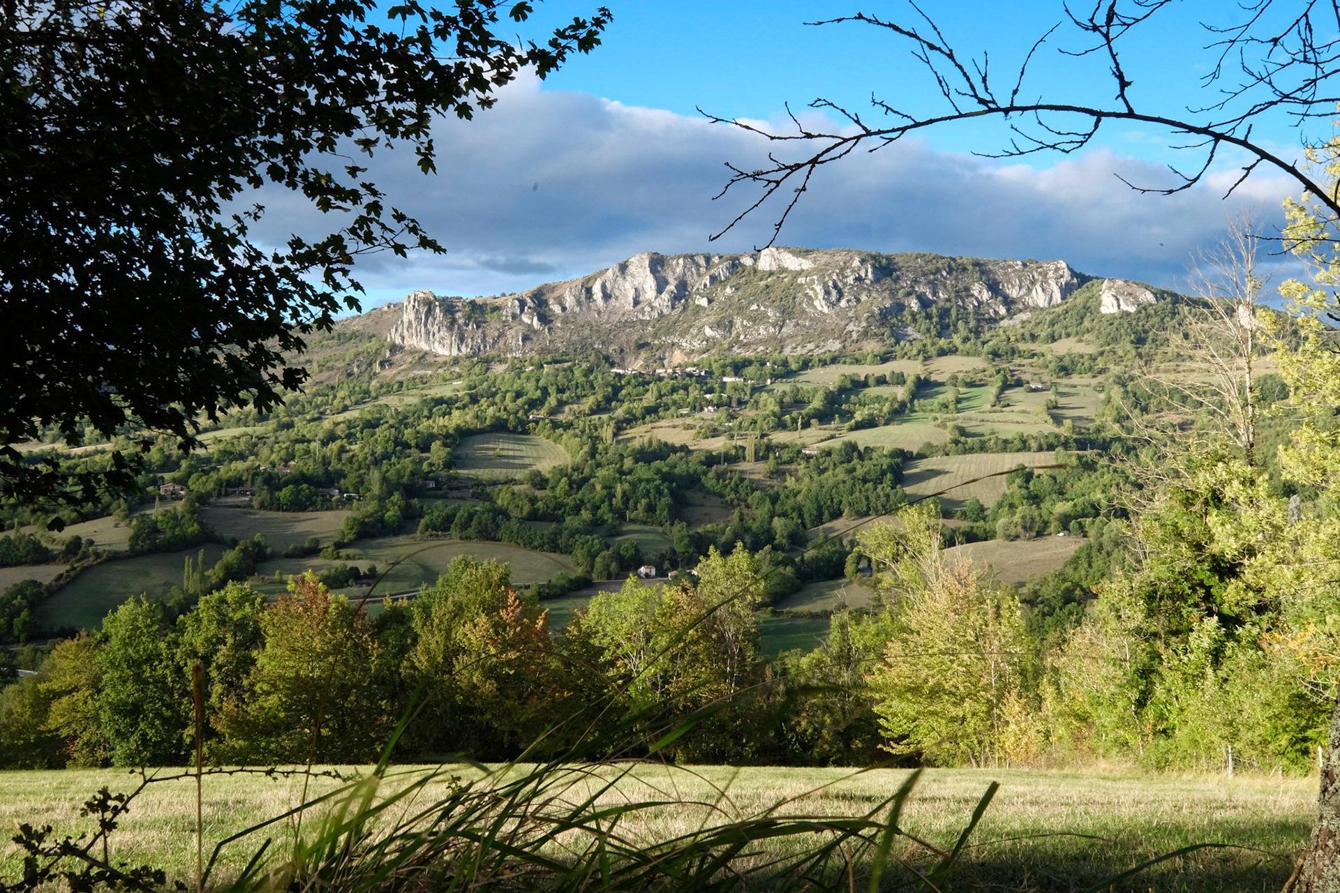 Depuis le hameau de Février sur les hauts de Nalzen, on a une vue superbe du Pech de Roquefixade et des hameaux sous le village.