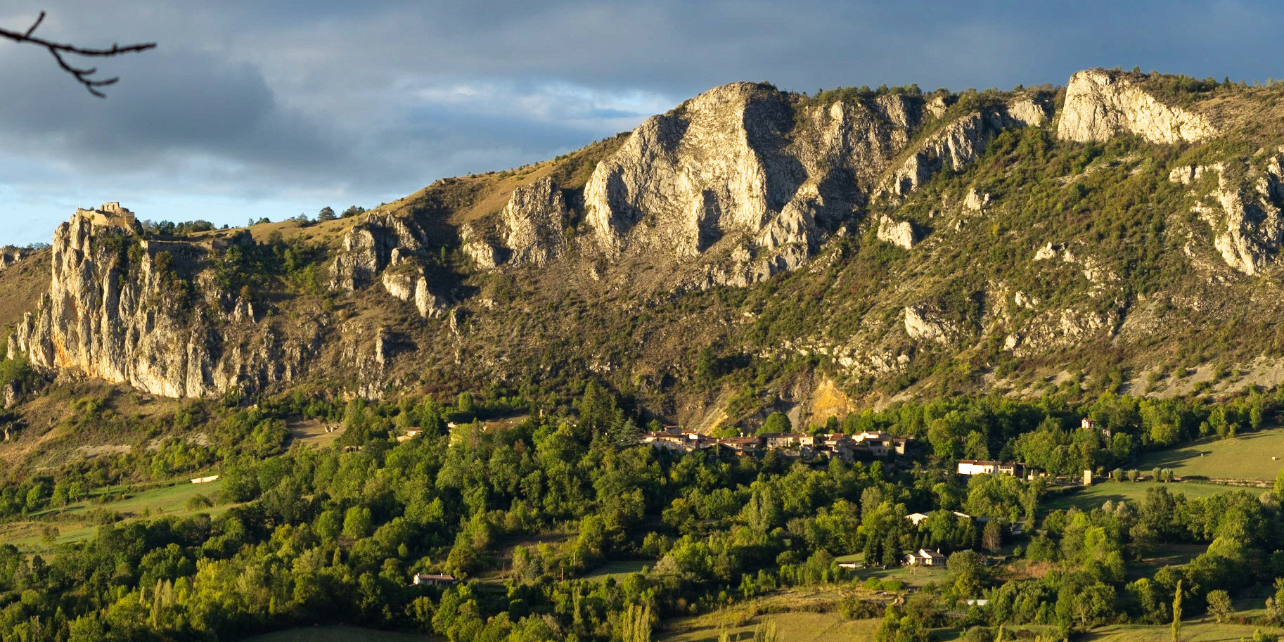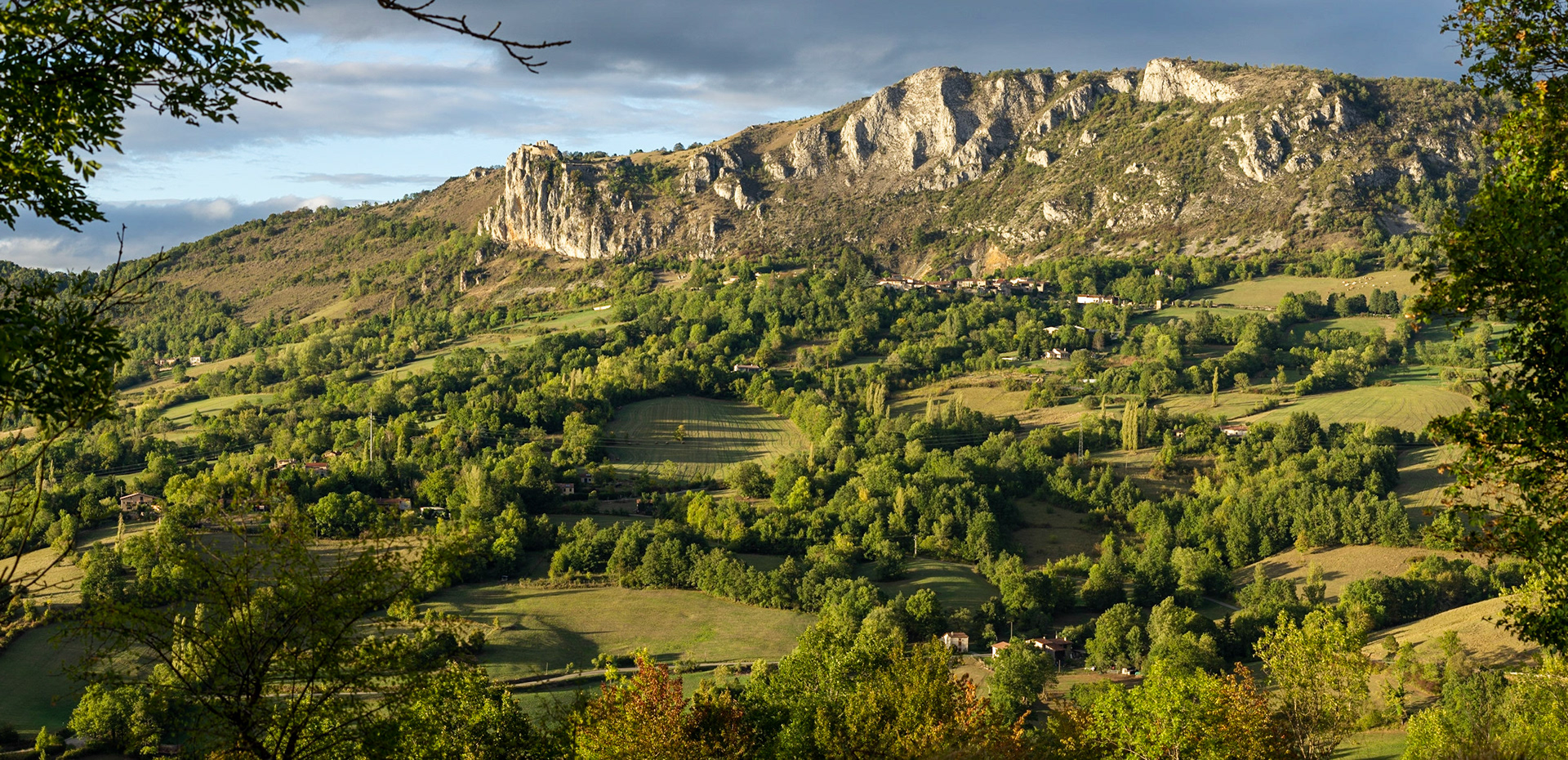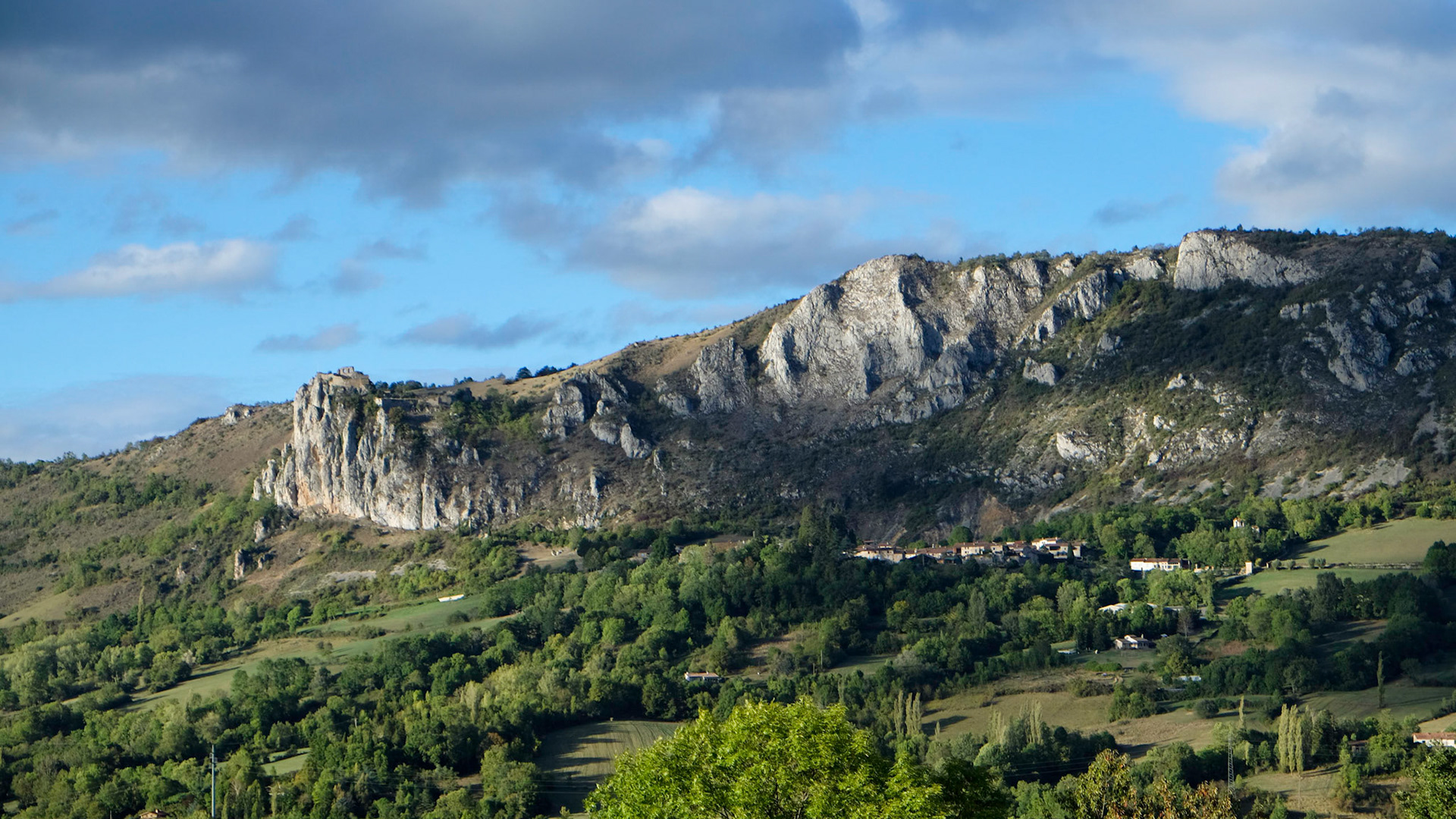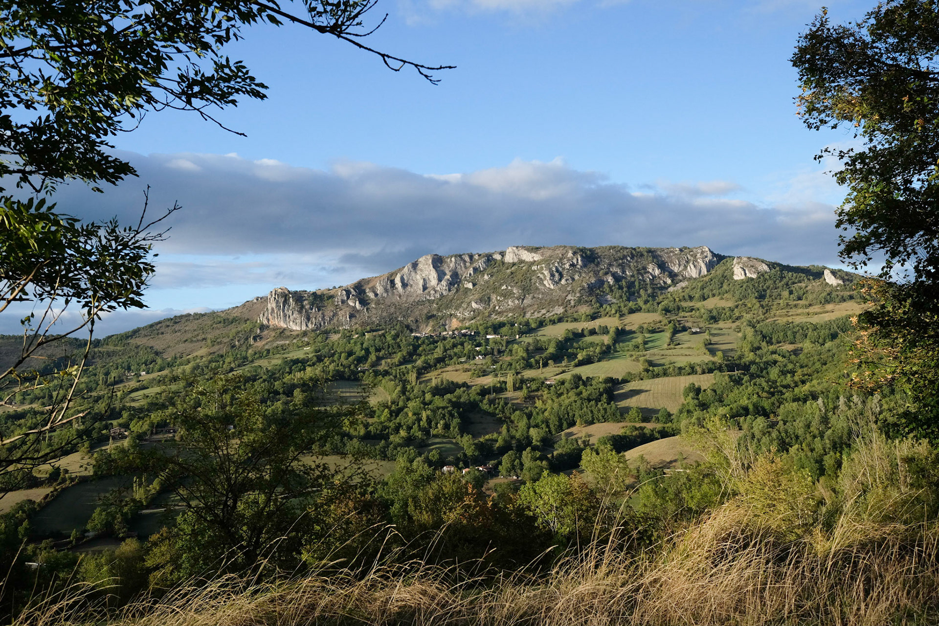 Depuis le hameau de Février sur les hauts de Nalzen, on a une vue superbe du Pech de Roquefixade et des hameaux sous le village.