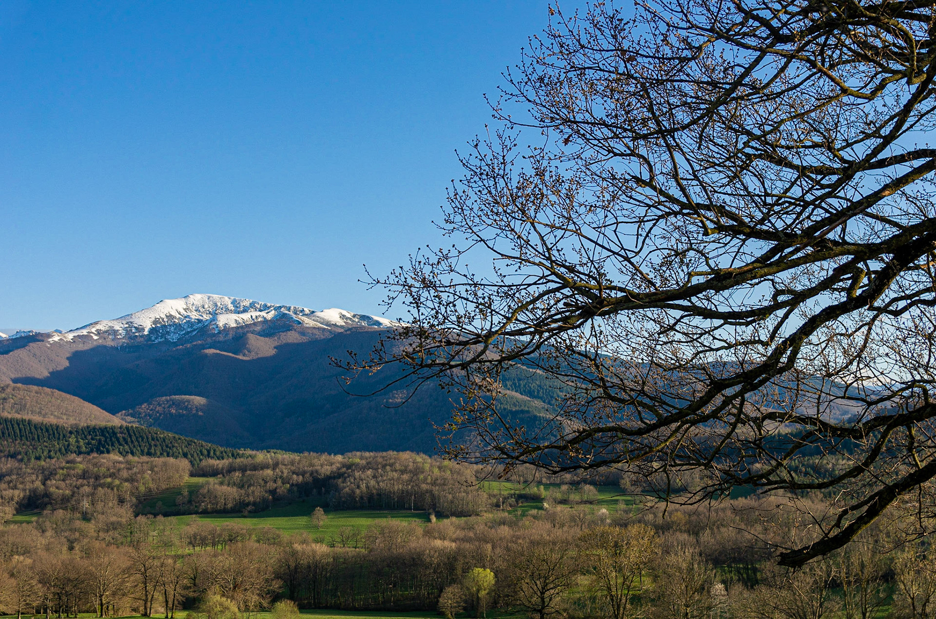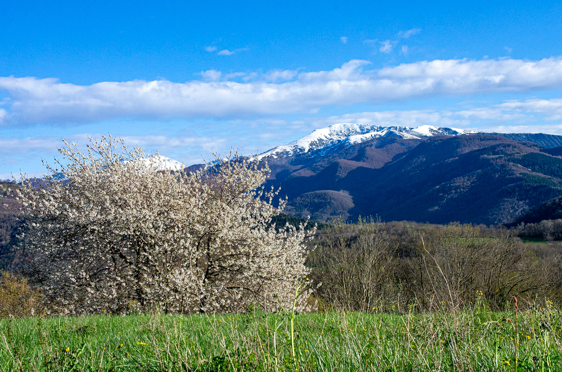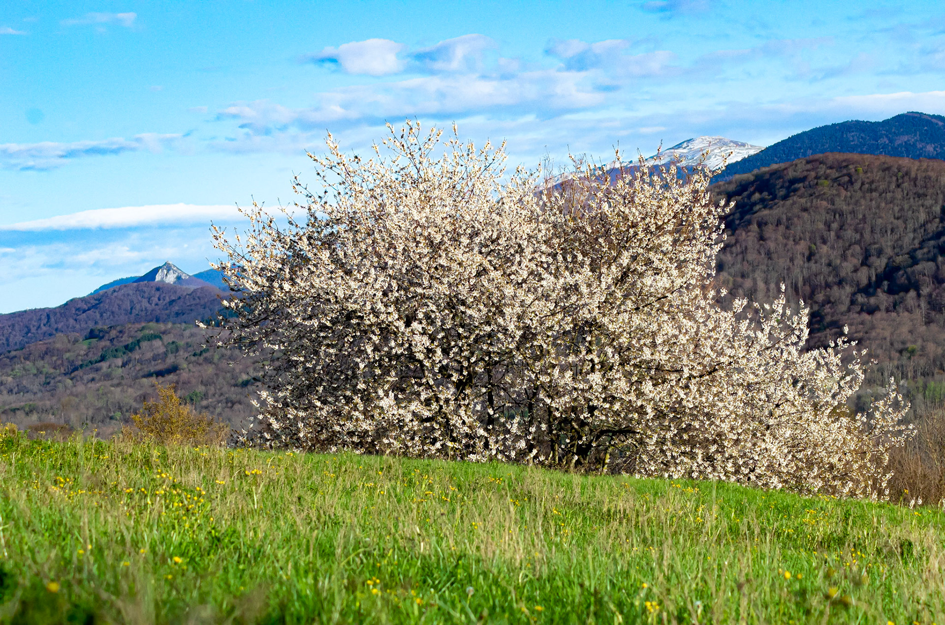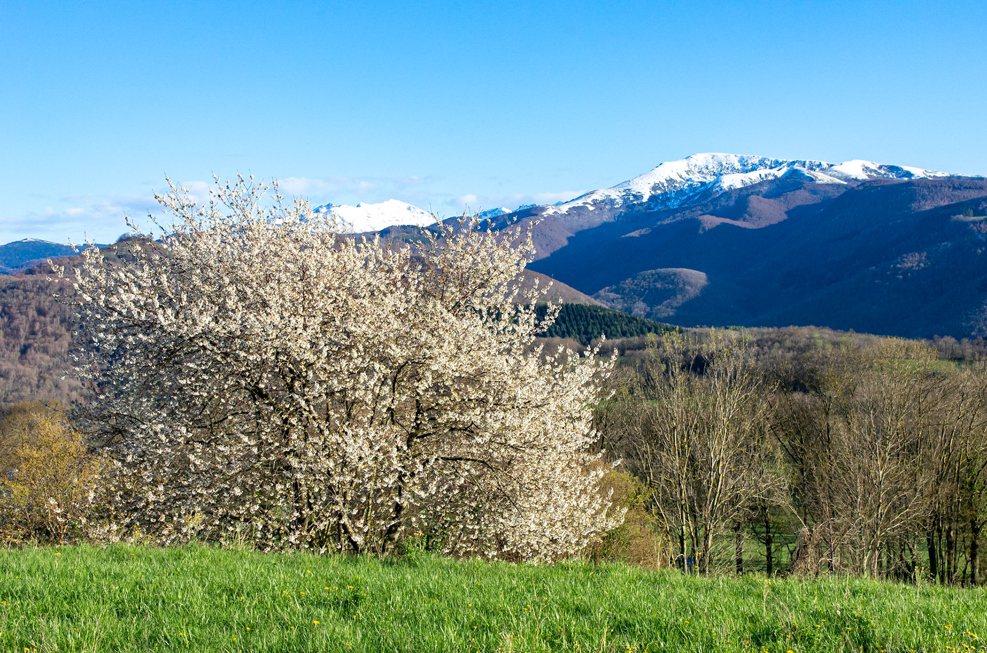 Le Fourcat, le massif de Tabe et au loin Montsegur depuis Soula. Les merisiers (cerisiers) en fleur marquent l'arrivée du printemps sur la vallée.