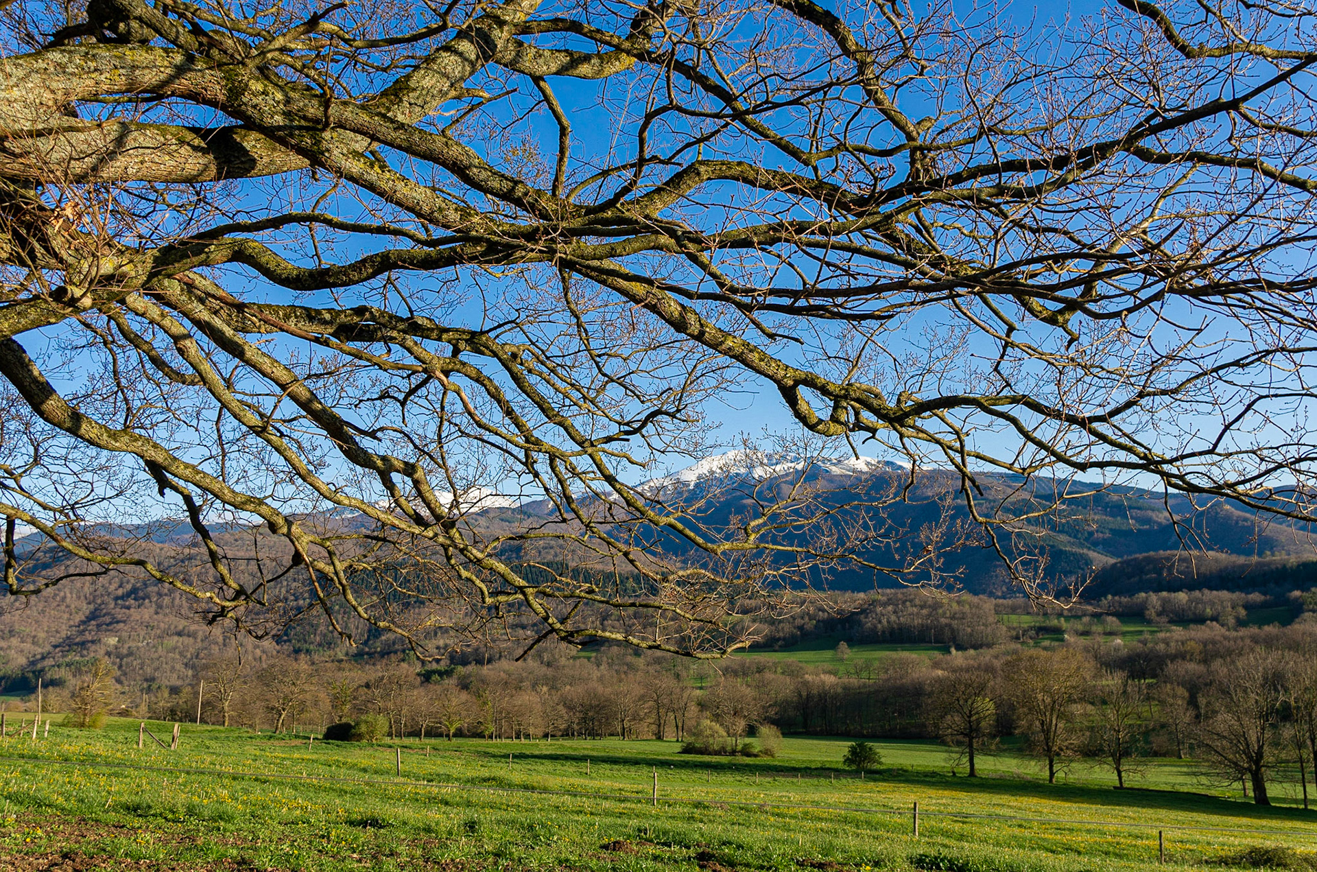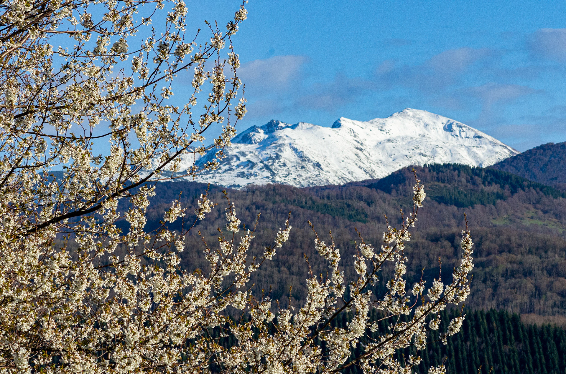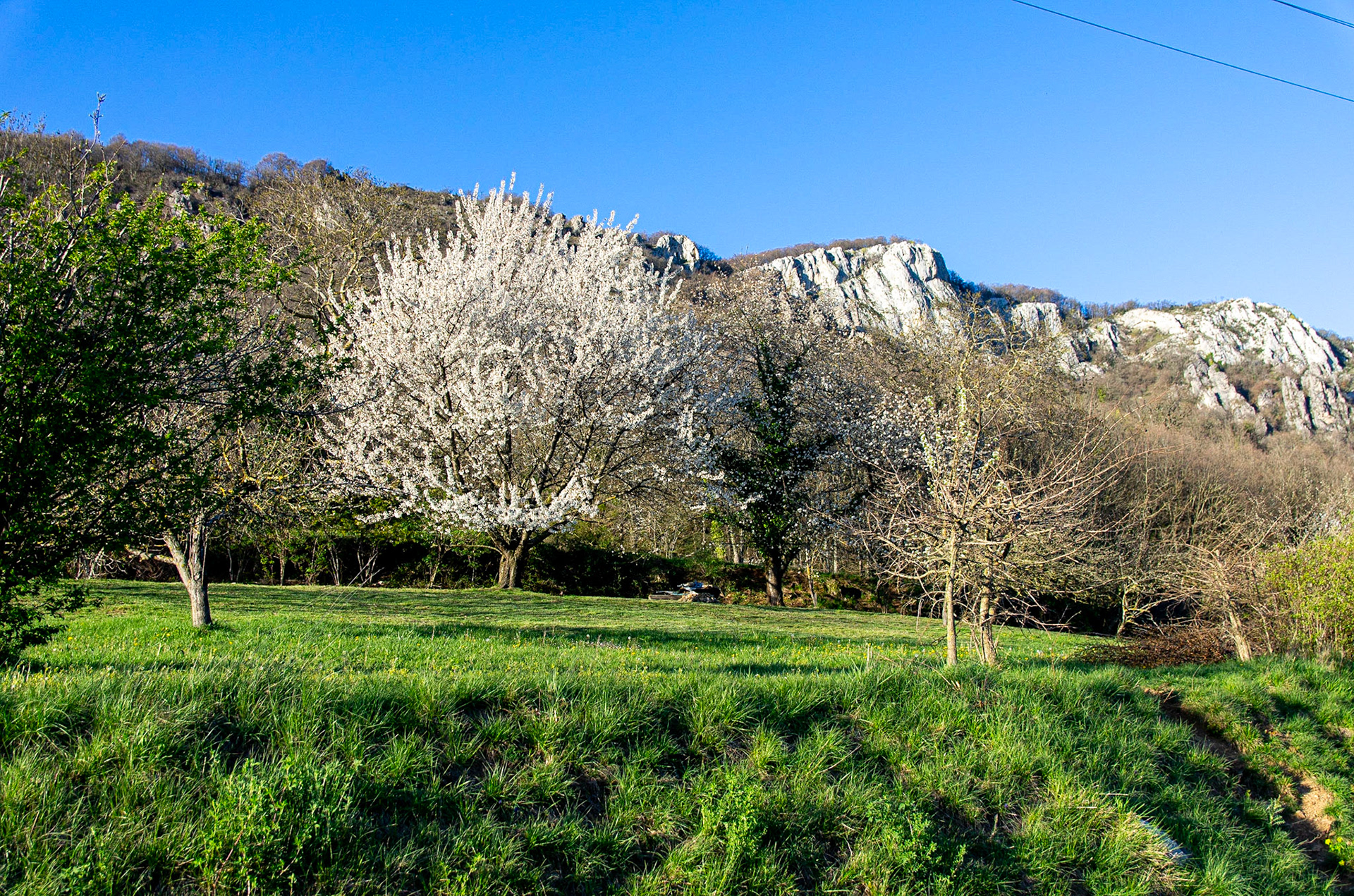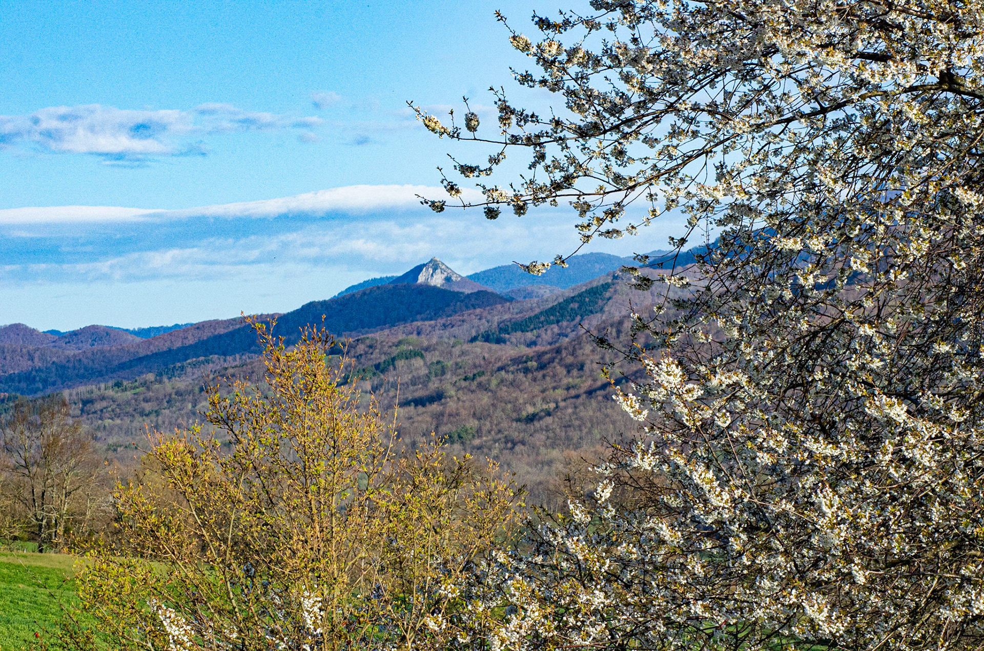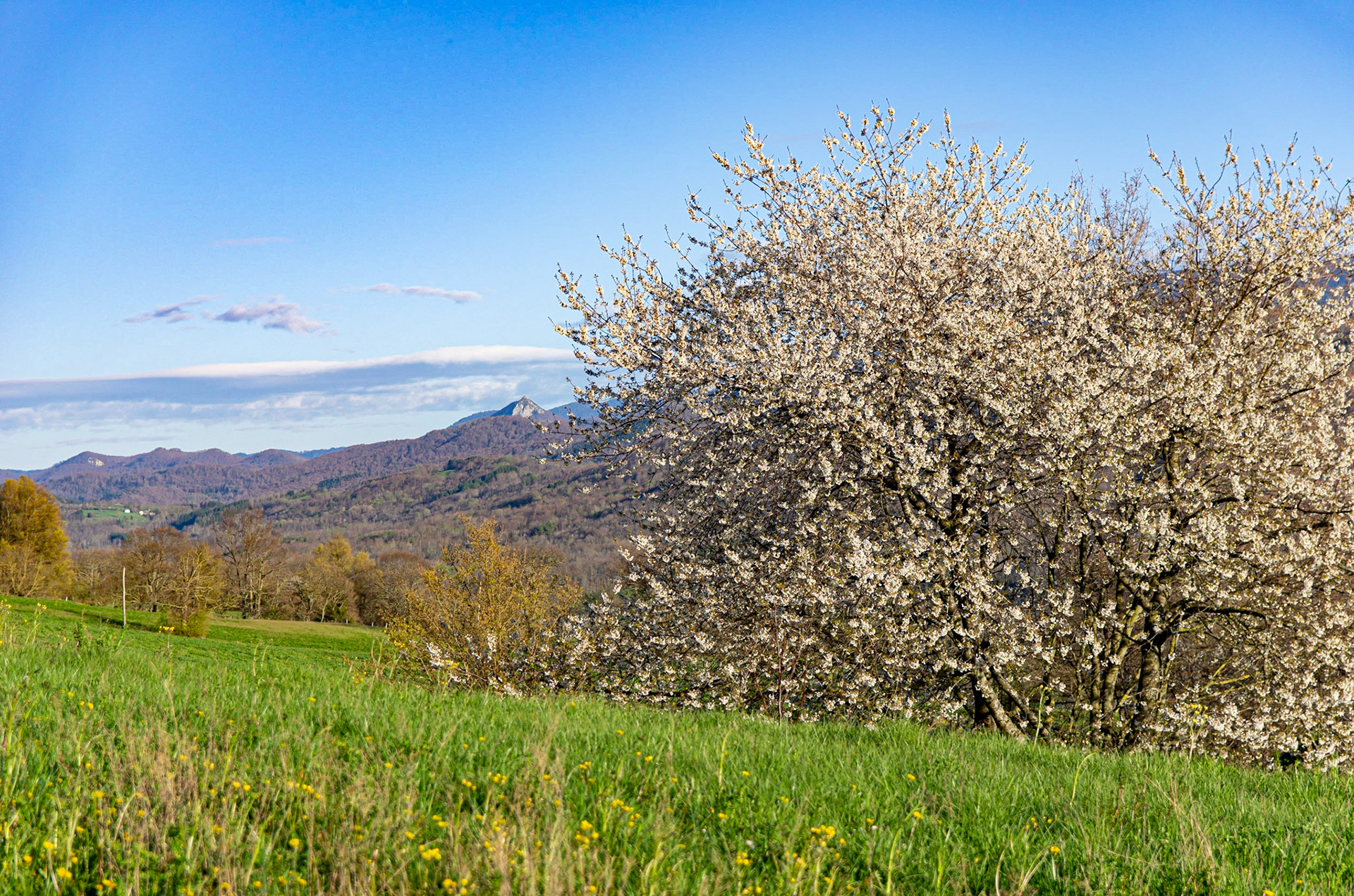 Le Fourcat, le massif de Tabe et au loin Montsegur depuis Soula. Les merisiers (cerisiers) en fleur marquent l'arrivée du printemps sur la vallée.